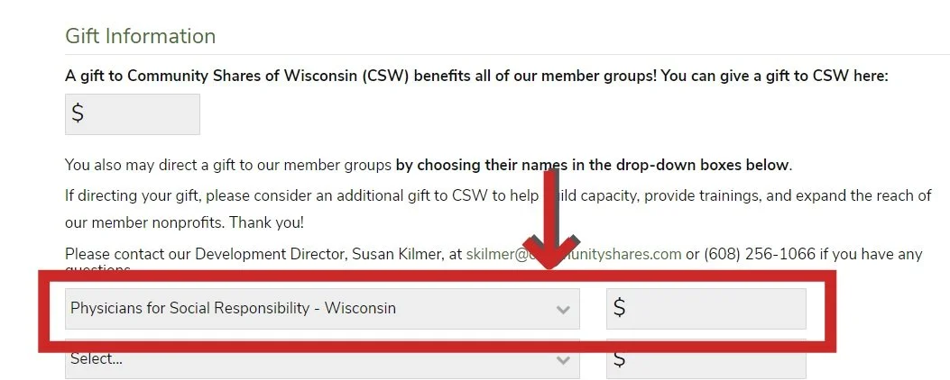 For donations, we use the services from Community Shares of Wisconsin. Select Physicians for Social Responsibility - Wisconsin from the drop-down boxes and enter your donation amount. If you wish to leave a note or designate your funds towards Point Beach, Chingari, or WEHN, please leave a message in the comment box at the end of the donation form.